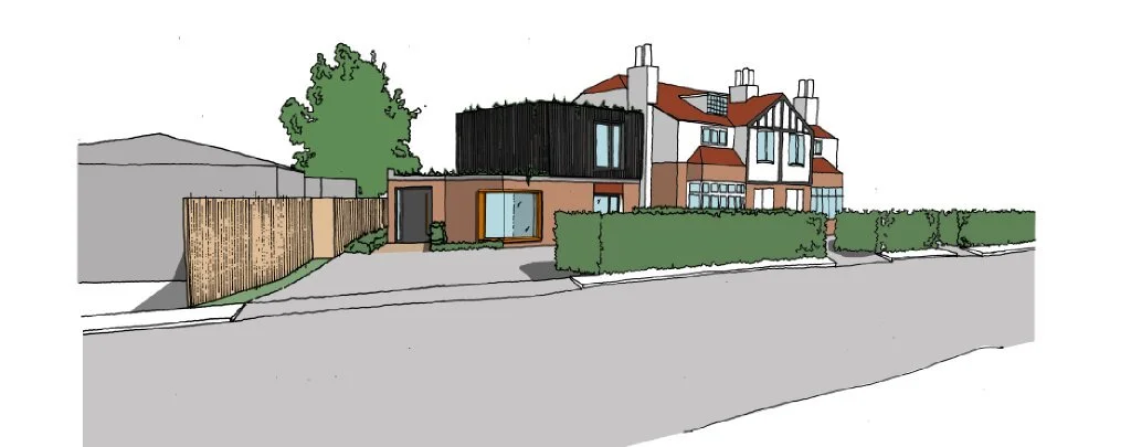 On the existing site sits a disused garage and a single storey side extension and our proposal is to build a two-storey, 3 Bedroom, 5 Person house featuring a living green Sedum roof, an Air Source Heat Pump system, parking bays and bicycle spaces.